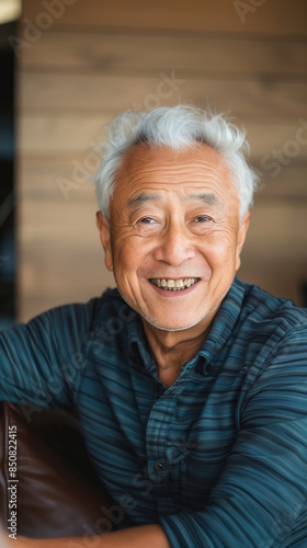 Smiling Elderly Asian Old Man with White Hair and Beard in Outdoor Setting