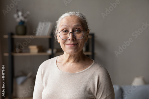 Smiling elderly grey haired lady in stylish glasses home head shot portrait. Happy senior retired woman holding video call, looking at camera, posing indoors with living room interior in background