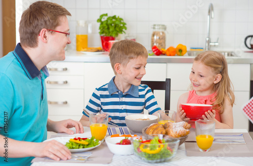 family, kitchen, eating, food, breakfast, happy, table, healthy, home, children, daughter, girl, people, father, young, meal, man, children, cheerful, together, indoor, female, smiling, boy, son, childhood, domestic, cooking, caucasian, white, male, children, enjoying, sitting, flake, croissant, carrot, salad, strawberry, talk, atmosphere, ambience