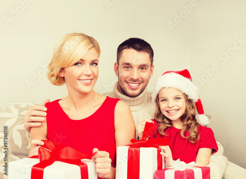 smiling family holding many gift boxes
