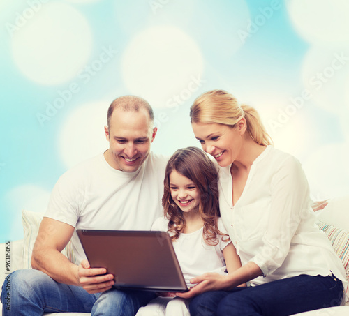 smiling family with laptop