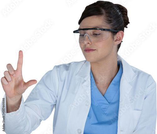 one person, young adult, woman, female, caucasian, scientist, science, apothecary, biology, biotechnology, doctor, medicals, physician, analyst, job, occupation, specialist, health care, expertise, profession, professional, care, studio shot, white background, uniform, holding, looking, test, experiment, analysis, chemical, examining, checking, imagination, pretending, beautiful, attractive, pretty, serious, concentration, focused, attentive