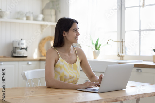 Smiling female sit at table with laptop in kitchen, make delivery order, purchasing products through online supermarket, studying or working using modern computer, enjoy day-off on internet at home