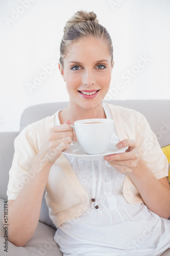 Smiling fresh model holding coffee sitting on sofa