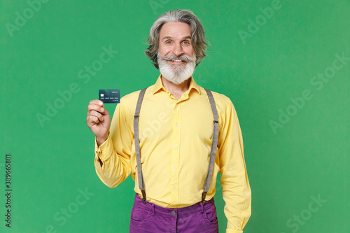 Smiling funny elderly gray-haired mustache bearded man wearing casual yellow shirt suspenders standing hold credit bank card looking camera isolated on bright green colour background studio portrait.