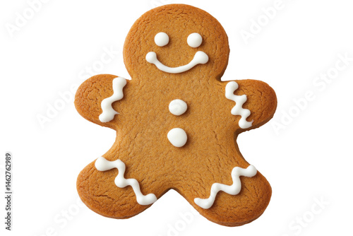 Smiling gingerbread cookie with white icing in classic holiday design, cut out - stock png.