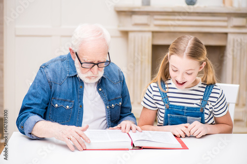 Smiling girl and grandfather in eyeglasses reading book together at home