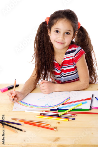 children, children, childhood, little, young, schoolchild, schoolgirl, girl, 1, cute, adorable, enjoying, funny, smiling, cheerful, happy, isolated, people, portrait, studio, white, caucasian, desk, table, notebook, paper, draw, art, artist, pen, crayons, wax crayons, colours, colourful, creative, inspiration, education, school, learning, study, painter, paint, rainbow, back to school, pupil