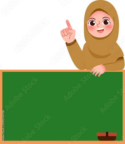 smiling girl, blackboard, pointing, blank, green, education, learning, teaching, presentation, announcement, message, advertisement, illustration, cartoon, cute, happy, friendly, children, girl, young, muslim, islam, religious, culture, diversity, design element, graphic, vector, image, template, background, copy space, school, classroom, student, teacher, cognition, information, idea, concept, website, banner, poster