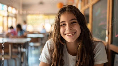 girl, student, classroom, school, smile, happy, desk, chair, blackboard, learning, education, young, female, brown, hair, white, shirt, indoor, daytime, light, background, sharpened, portrait, look, camera, face, casual attire, day, bright, cheerful, positive, confident, teenage, woman, cognition, life, setting, environment, joyful, energy, optimistic, enthusiastic, smiling, eye, beautiful, decor, supply, blackboard, generative