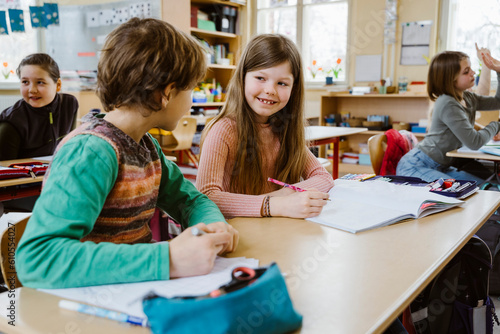 Smiling girl talking to male friend while sitting at desk in classroom