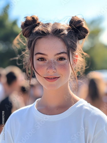 smiling, girl, freckle, messy, bun, white, t-shirt, fair, happiness, joy, fun, festival, youth, vibrant, carefree, cheerful, candid, portrait, lifestyle, friends, enjoyment, amusement, event, colourful, playful, expression, excitement, beautiful, summer, natural, light, innocence, femininity, beauty, sun, adventure, culture, entertainment, youthfulness, engagement, casual attire