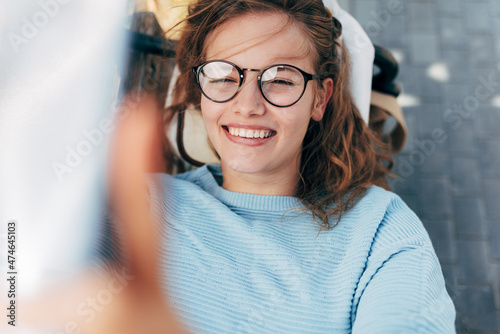 Smiling gorgeous female dressed in blue sweater, eyeglasses, lying on the bench, and taking selfie on mobile phone. Happy woman takes a rest during online conversation on a smartphone outside