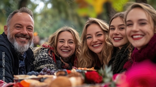 smiling, group, caucasian, adult, young, picnic, autumn, happiness, friends, family, gathering, nature, leaf, fall, joyful, cheerful, together, bonding, celebration, laughter, joy, vibrant, colourful, foliage, leisure, companionship, fun, relaxation, cosy, warmth, meal, feast, food, drink, table, park, outing, fellowship, enjoyment, weekend, get-away, retreat, sharing, outdoors