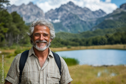 bergsee, mountain landscape, hiker, adventure, nature, outdoors, travel, happy, mountain chain, green, forest, backpack, beard, man, grey hair, summer