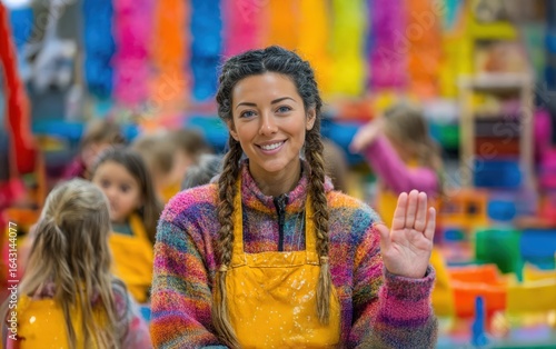 Smiling Hispanic Teacher with Braids and Yellow Apron in a Classroom, Waving Hand, Surrounded by Children, Colorful Backdrop