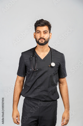 smiling indian doctor or surgeon in black uniform with stethoscope on gray background