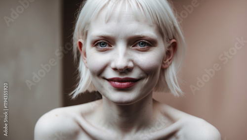 Smiling individual with light blonde hair poses in a neutral-toned setting, capturing a moment of joy and serenity