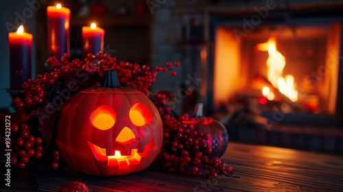Smiling jack-o-lantern with glowing candlestick, surrounded by candles, and warm fireplace