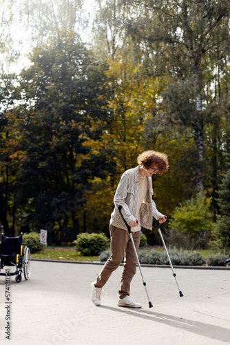 Smiling, joyful man on crutches walks on the street. A young guy in glasses is recovering from an injury on the background of a wheelchair.