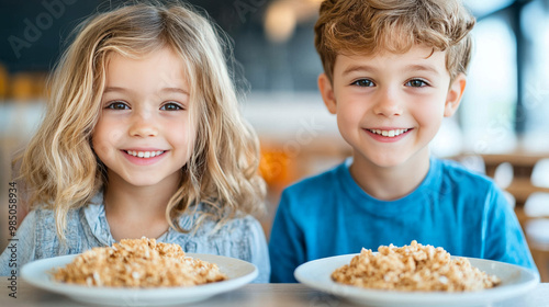 children, children, girl, boy, smiling, happy, meal, food, eating, togetherness, joy, childhood, casual attire, table, blonde hair, blue shirt, white shirt, plate, young, family, friends, eatery, cafes, indoor, caucasian