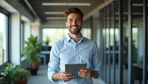 Smiling Latin Male Project Manager in Office Using Tablet - Vector Art
