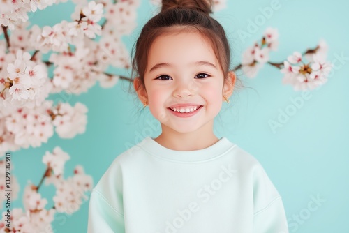 smiling little girl wearing pastel mint sweatshirt with cherry blossom branches in the background