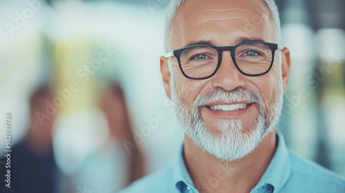 man, smiling, portrait, goggles, blue shirt, happy, professional, office, business, caucasian, middle-aged, white beard, adult, confident, friendly, successful, casual attire, positive, closeup, head shot, workplace, businessperson, executive