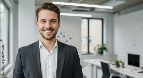 man, suit, jacket, smiling, office, modern, corporate, business, professional, confident, happy, portrait, indoor, workspace, desk, computer, light, bright, cheerful, executive, employee, entrepreneur, male, person, adult, positivity, success, leadership, management, work, job, career, occupation, attire, formal, smart, clean, design, interior, window, blurred background