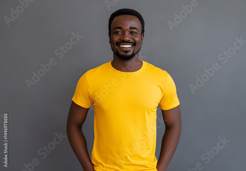 man, african american, smiling, happy, yellow shirt, t-shirt, casual attire, portrait, studio, grey background, young adult, male, positive, photogenic, fashion, style, model, clean, simple, minimalism, african, black, adult, people, person, face, expression, emotion, confident, joyful