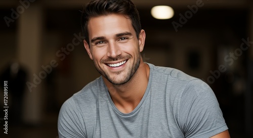 man, portrait, smile, happy, person, male, face, eye, hair, smiling, attractive, expression, t-shirt, grey, casual attire, clothing, indoor, light, soft, lighting, sharpened, people, adult, positive, friendly, head shot, closeup, studio, neutral, natural, healthy, confident, calm, isolated, copy, space, warm, gentle