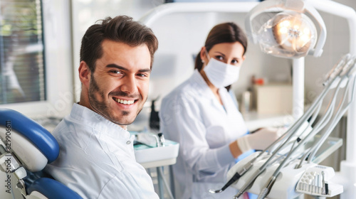 Smiling man sitting in dental chair in modern dental clinic