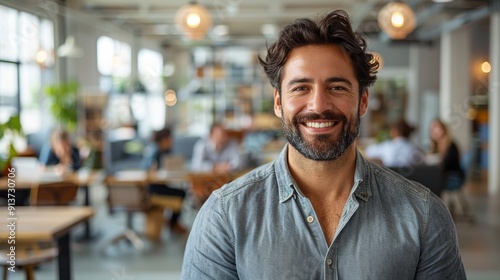 Smiling Man With Beard Sitting in Modern Office Environment During Daytime
