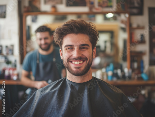 man, barber, haircut, smiling, salon, cape, happy, grooming, stylish, european, hair, beauty, client, barbershop, male, portrait, cheerful, young, professional, service, hairdresser, facial, casual attire, indoor, lifestyle, tool, product, friendly, shop, modern, trendy, relaxation, confidence, styling, care, personal, fresh, look, atmosphere, joy, satisfaction, adult, beard, closeup, fashion, model, interior, life events
