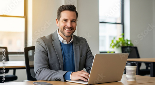 businessman, laptop, business, computer, office, working, desk, notebook, work, people, manager, smiling, sitting, photogenic, men at work, technology, person, smile, looking, professional, job, boss, cyberspace, suit, success, corporate, man, happy, entrepreneur, executive, adult, male, employee, casual attire, smart, confident