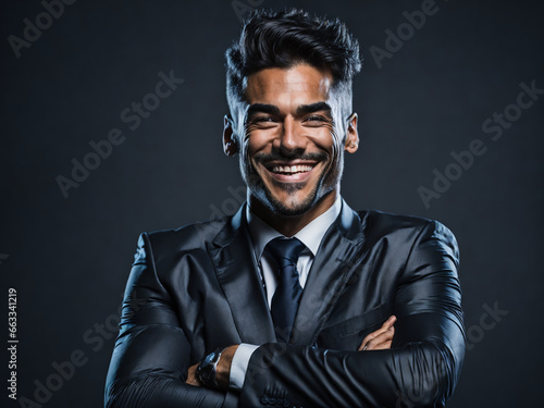 Smiling mature confident professional executive manager, Businessman leader wearing black suit, Happy middle aged business man ceo standing in office arms crossed, Proud leader. ai generative