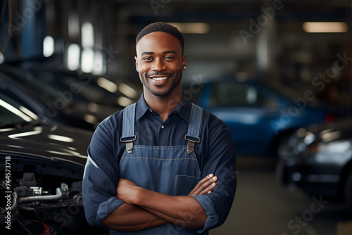 Smiling mechanic black man. Automotive professions. Job offer. Job Search. Machine repair professions. Black man. Africa. Afro american. AI.