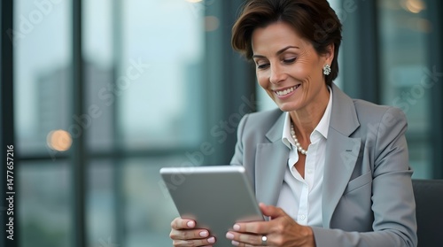 Smiling middle-aged Caucasian woman in a gray suit, reading on a tablet in a modern office setting.