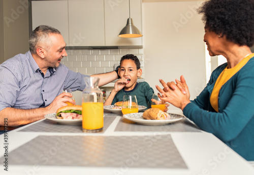 family, eating, breakfast, morning, son, together, smiling, sandwich, sitting, home, table, love, father, diversity, mother, african american, calmness, children, mid, three, black, wife, father, mother, house, lifestyle, people, fun, happiness, adult, juice, children, cheerful, woman, man, food, meal, eltern, caucasian, happy, boy, male, indoor, kitchen, children