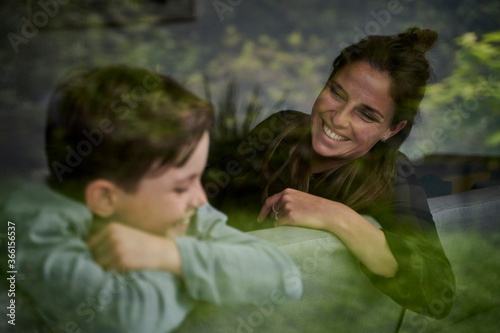 Smiling mother looking at son while sitting on sofa at home seen through window