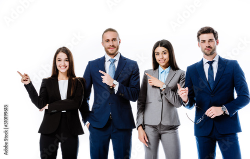 smiling multicultural business people in suits pointing with fingers aside isolated on white
