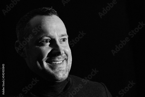 Smiling nice man with shining eyes and turtleneck sweater in the low key picture black and white profile