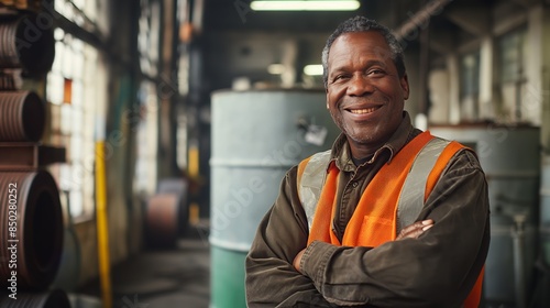 Smiling Older Male Warehouse Worker in Safety Vest with Arms Crossed
