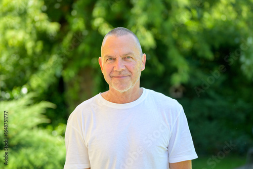 senior, adult, background, calm, casual attire, cheerful, confident, expression, face, fashion, friendly, greenery, happy, healthy, lifestyle, male, man, natural, nature, older, peaceful, portrait, relaxed, smiling, soft, standing, summer, sunlight, t-shirt, white
