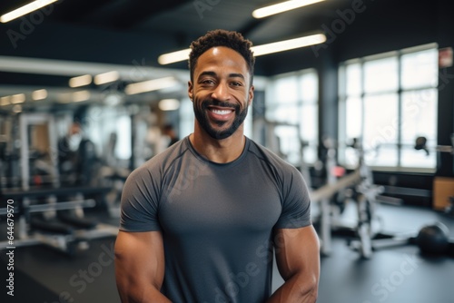 Smiling portrait of a happy young male african american fitness instructor in an indoor gym