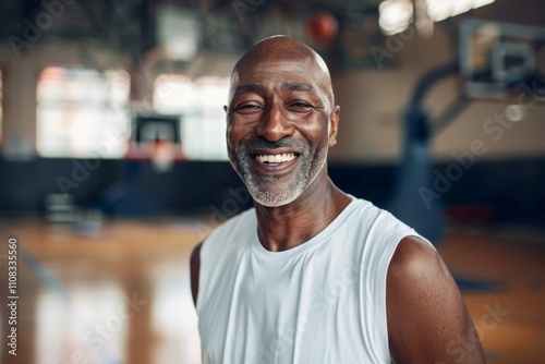people, portrait, smiling, senior, male, african american, basketball, player, athlete, sport, fitness, team, active, ball, game, court, mature, healthy, wellness, athletic, confidence, strength, determination, professional, hobby, exercise, sporty, diverse, inclusion, equity, training, energy, black, individual, competitive, basketball court, action, physical activity, recreation, happy, positive, sharpened, skill, indoor, challenger, lifestyle