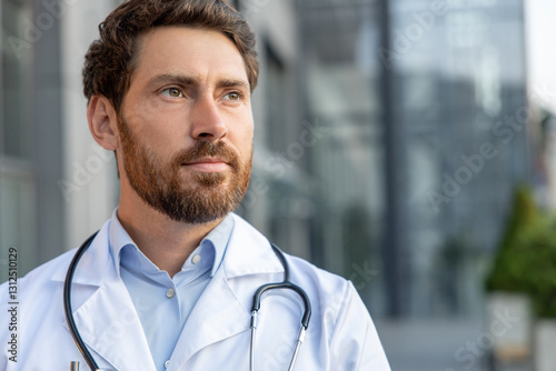 30s, bearded, caucasian, clinic, confident, doctor, ginger, photogenic, job, labcoat, lifestyle, male, man, medicals, occupation, outdoors, positive, profession, professional, resolute, serious, stethoscope, healer