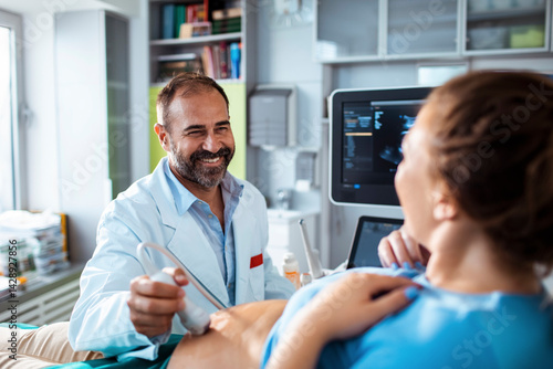 Smiling pregnant woman having ultrasound scan with male doctor in clinic