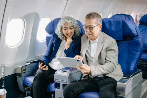 Smiling senior couple of Asian tourists take photos of each other while sitting on a plane. with digital tablet, laptop and smartphone. Travel in style, work
