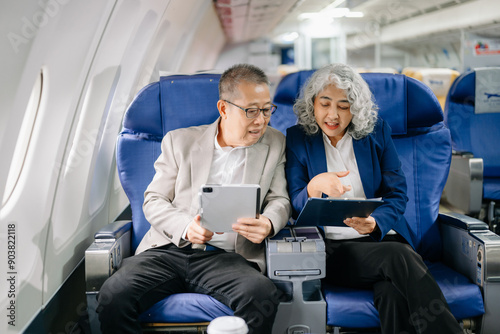 travel, aeroplane, holiday maker, senior, couple, asian, photo, vacation, journey, trip, sightseeing, adventure, holiday, exploring, flight, relaxation, happiness, leisure, smiling, technology, digital, tablet, laptop, smartphone, window, seat, lifestyle, elderly, fun, life events, togetherness, memory, enjoyment, aviation, in flight, sky, modern, cheerful, bonding, love, culture, global, transport, comfort